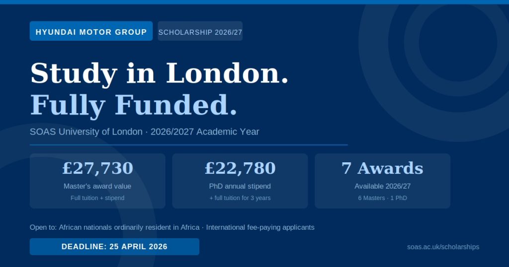Are you an African national with ambitions to study at one of the UK’s top universities? The Hyundai Motor Group Scholarships 2026/2027 are now open, offering full funding for African students to pursue postgraduate studies at SOAS University of London.